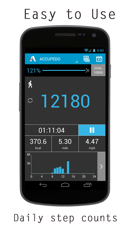 An intelligent 3D motion recognition algorithm is embedded to track only walking patterns by filtering and ejecting out non walking activities. Accupedo counts your steps regardless of where you put your phone like your pocket, waist belt, or bag. Be healthy by setting up your daily goal and accurately monitoring your steps with Accupedo.