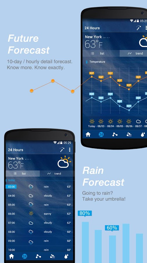 GO Weather forecasts on 100,000+ locations worldwide, provides detailed weather report, accurate weather forecast, interactive maps image, incredibly beautiful user interface with variety of widget themes and live wallpapers. Being your best weather prophet is always what we are pursuing.